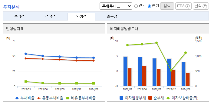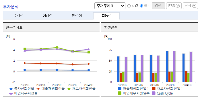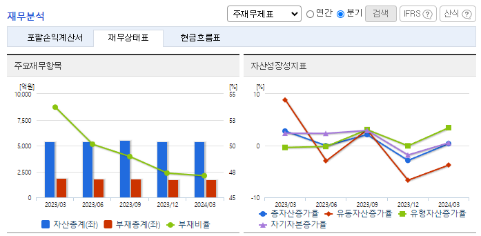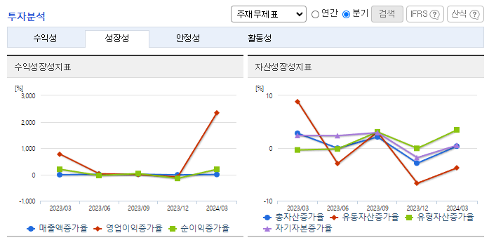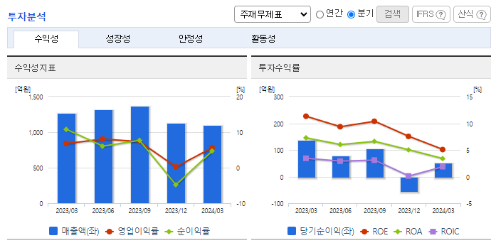 -2024년 3월 전년동기 대비 연결기준 매출액은 13.5% 감소, 영업이익은 28.2% 감소, 당기순이익은 62.2% 감소. 지난해 2분기 이후 매출 상승세가 둔화되면서 전년동기 수준을 하회하는 매출 기록하였으며, 이러한 영향으로 영업수익성은 비교적 큰 폭의 하락세를 시현함. 플라스틱 산업의 긍정적 전망과 함께 꾸준한 매출활동 및 대체품 개발 노력 등으로 성장 가능할 것으로 기대함.