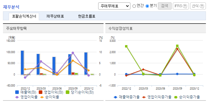 -2023년 12월 전년동기 대비 연결기준 매출액은 15.8% 감소, 영업이익은 60.2% 감소, 당기순이익은 54.9% 감소. 동사의 이익극대화를 위한 지속적인 노력에도 불구하고 정제마진의 약세로 전년 대비 매출과 영업이익이 감소함. 정유와 윤활제품의 경우 안 좋은 환경에도 견조한 매출을 유지했으나, 회사의 또 다른 주력 상품인 석유화학제품의 경우 최대시장인 중국의 경기둔화로 수익성 약세가 지속됨.