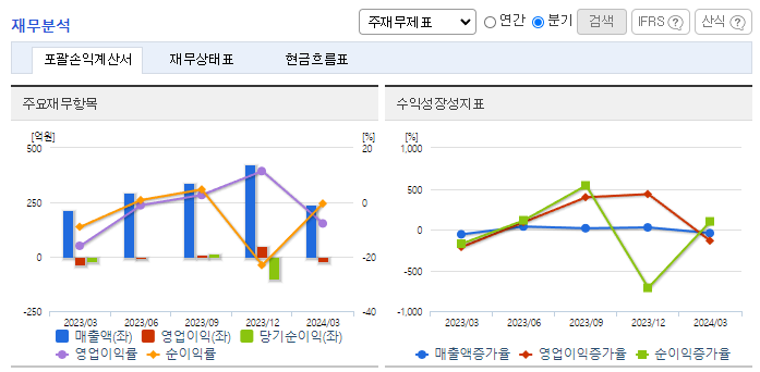 -2024년 3월 전년동기 대비 연결기준 매출액은 11.7% 증가, 영업손실은 45.7% 감소, 당기순손실은 93.6% 감소. 동사의 광고대행사업이 전년대비 42.7%, 여행사업이 39.6% 증가하며 영업이익이 전년동기 대비 개선됨. 여행사업은 글로벌 팬들이 한국의 K-Pop 공연을 관람하고 한국 문화를 향유하는 'K컬처 여행 상품'을 런칭하여 매출 증대를 이룸.