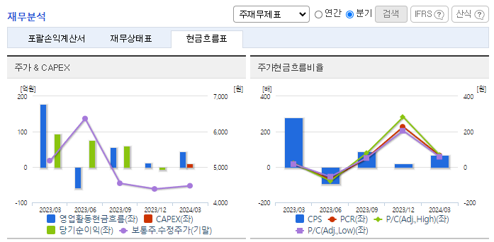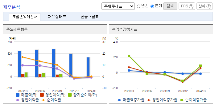-2024년 3월 전년동기 대비 연결기준 매출액은 25.3% 감소, 영업이익 적자전환, 당기순이익 적자전환. 동사의 영업손실 원인으로는 자회사 YG인베스트먼트의 평가손실, 플랫폼 개발 및 신규 투자 비용 집행 등이 있음. 지난해 호실적에 기여한 블랙핑크 월드 투어 효과가 사라졌고, YG 및 하이브 소속 주요 아티스트의 활동 부재도 저조한 분기 실적의 원인이 되었음.